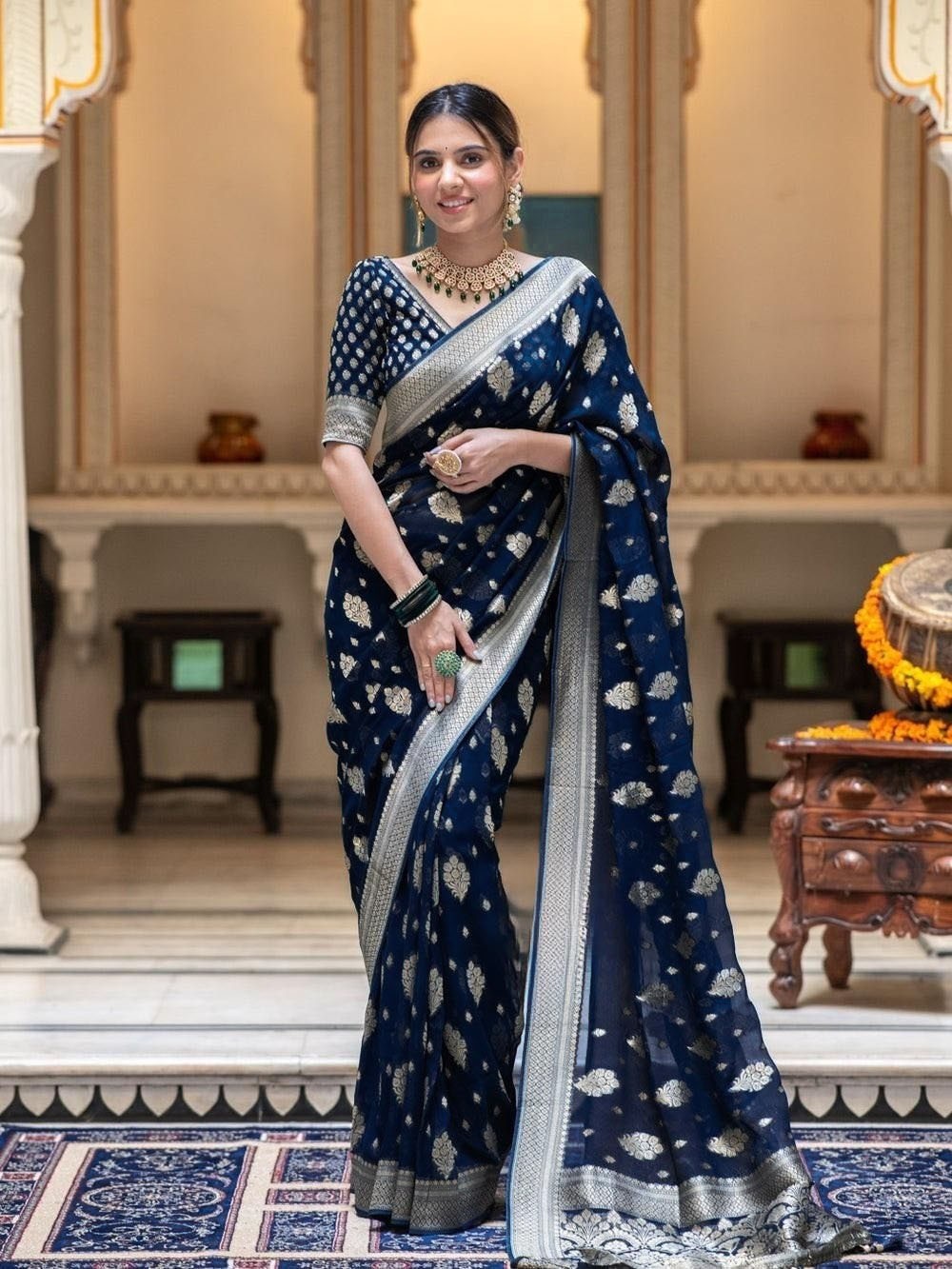 Beautifully woven with traditional zari motifs & jacquard border for a rich ethnic look.