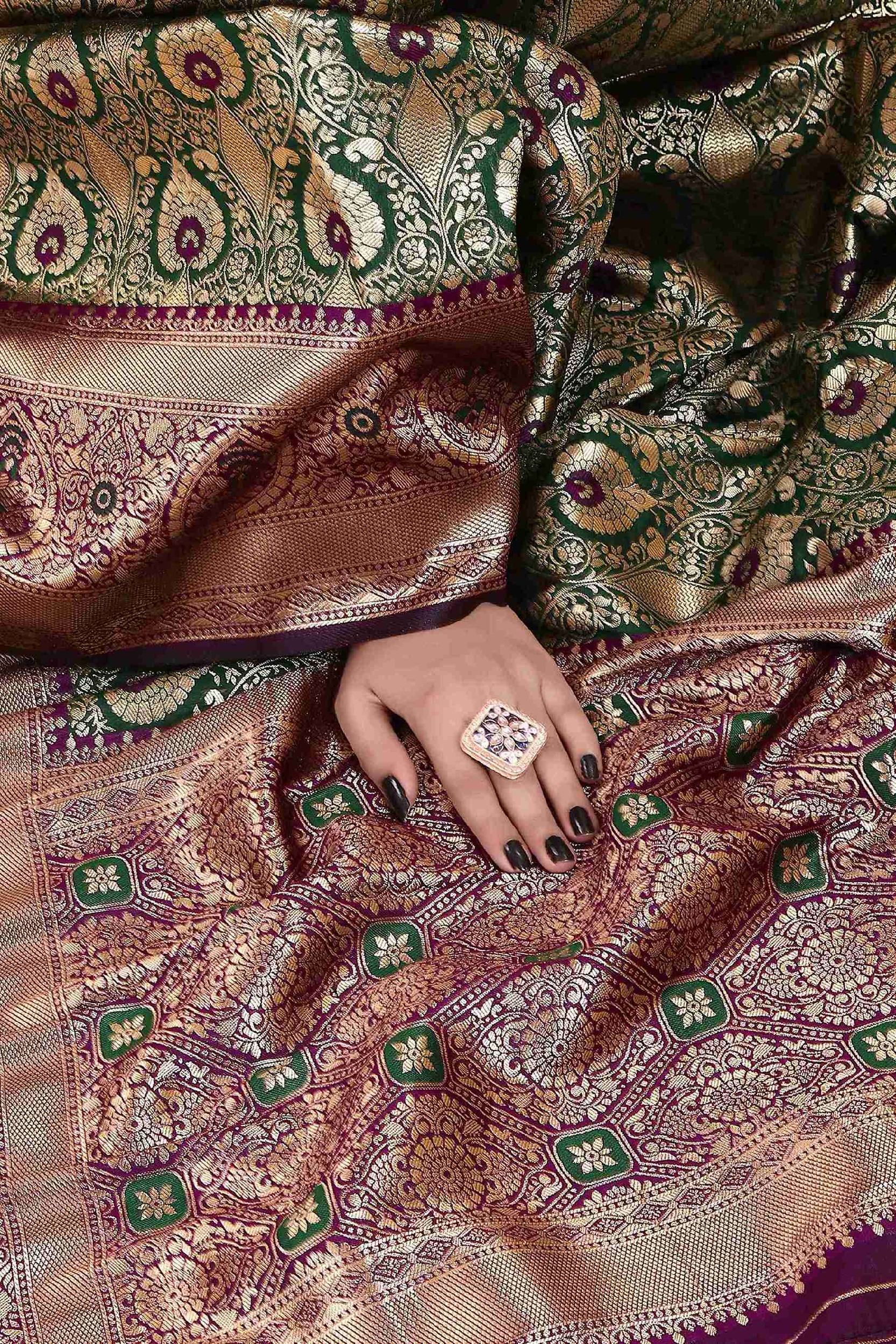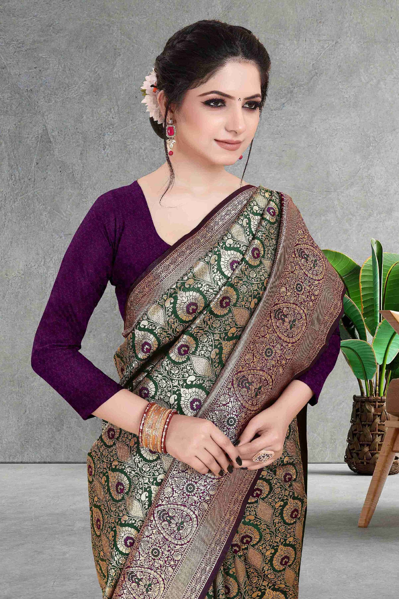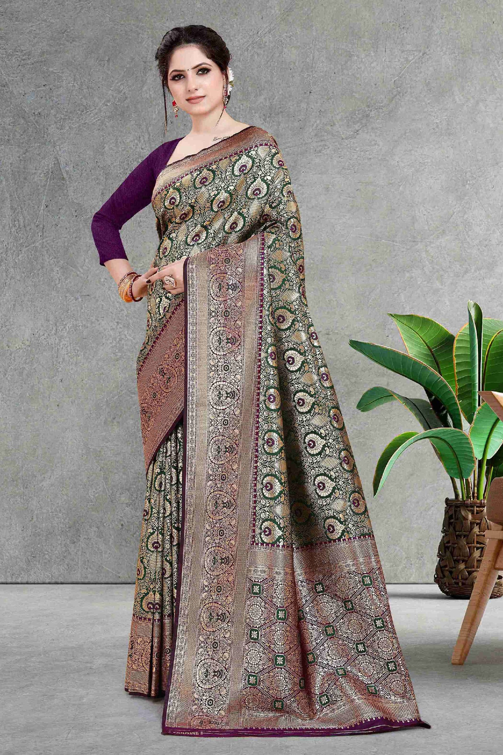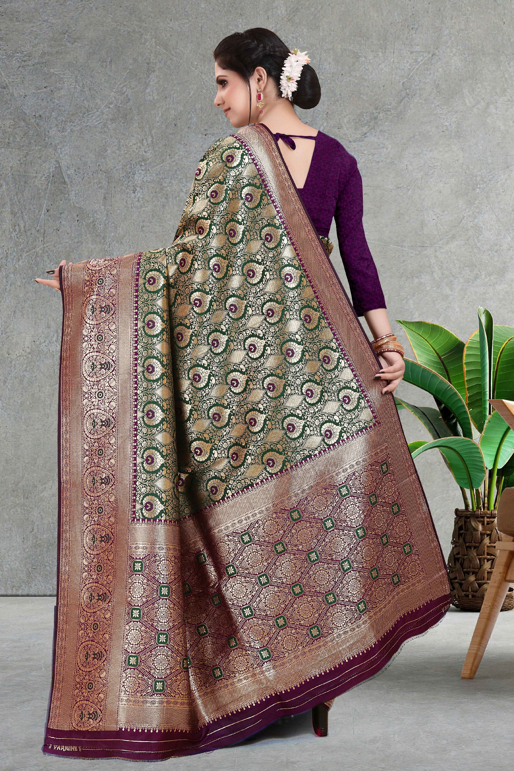 Description - _This Kanjeevaram saree comes in dual colour contrast pallu/body where body has a beautiful floral kattam with butta, intricate koravi border, and a rich pallu._